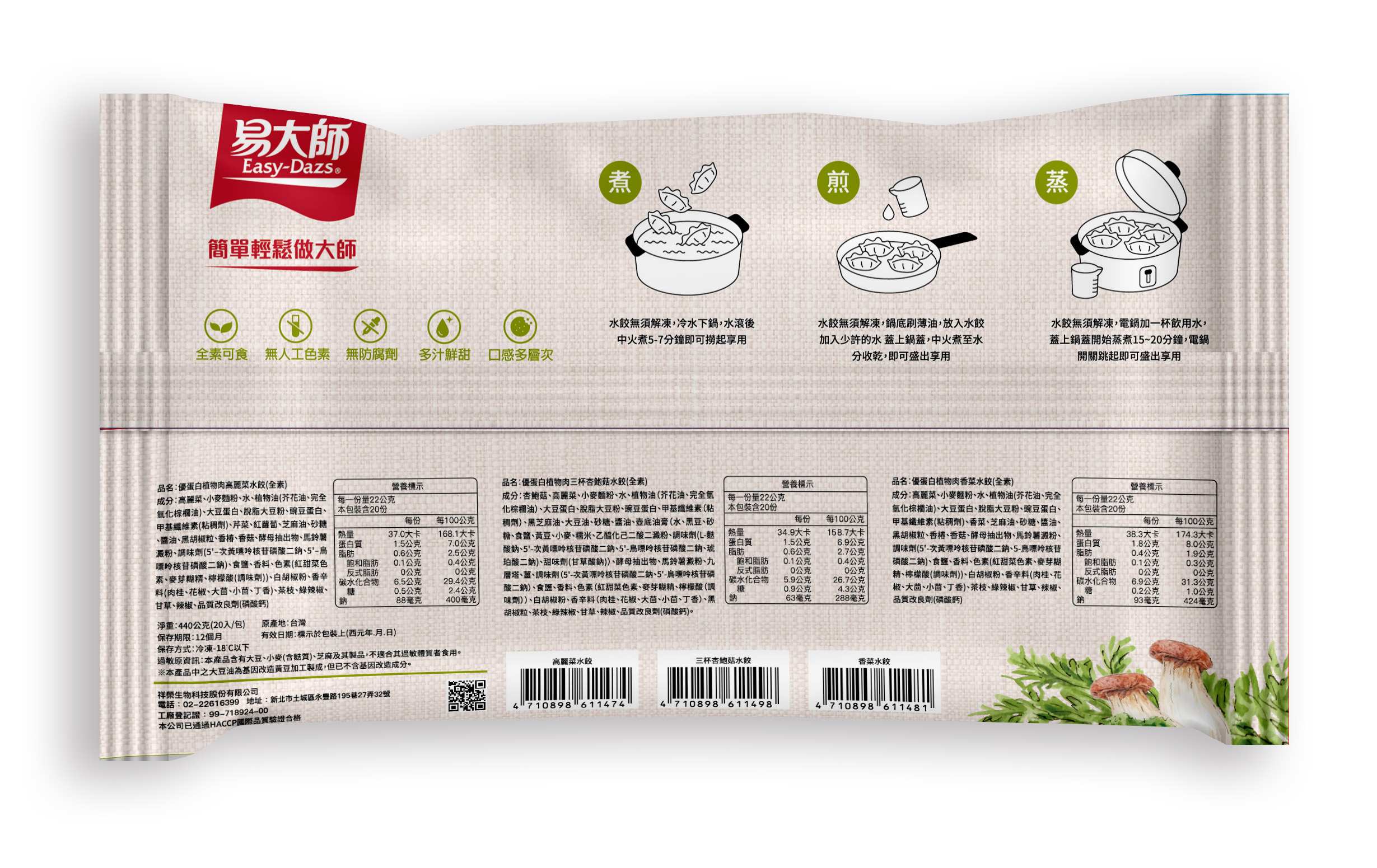 成分:高麗菜、小麥麵粉、水、植物油(芥花油、完全氫化棕櫚油)、大豆蛋白、脫脂大豆粉、