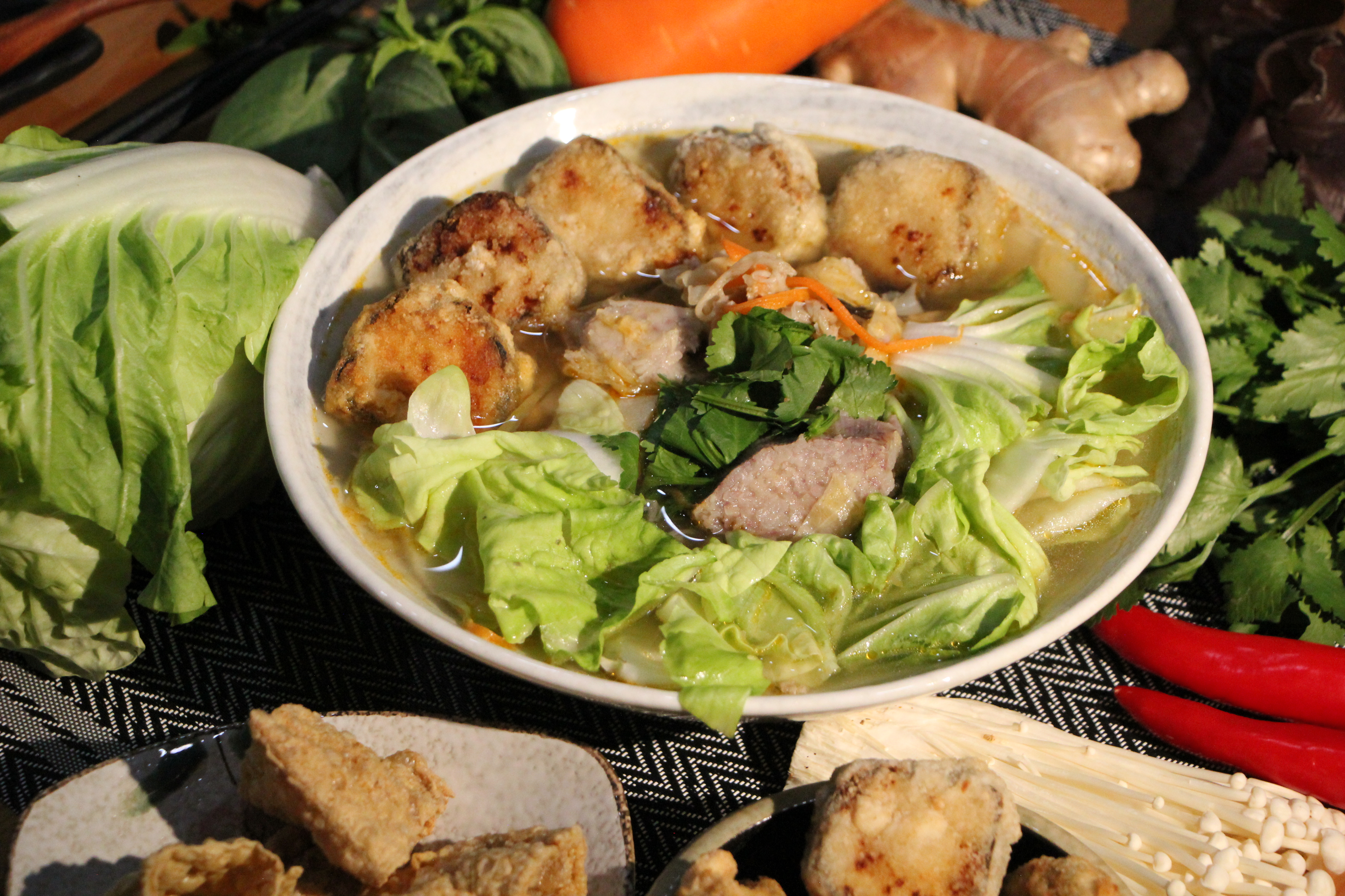 產品成分:大白菜、金針菇、芋頭、紅蘿蔔、九層塔、木耳、薑、豆皮(黃豆、大豆油、消泡劑(脂肪酸甘油脂、碳酸鈣、大豆卵磷脂、矽樹脂))鹽、糖、水、調味劑(L-麩酸鈉、琥珀酸二鈉、5'-次黃嘌呤核苷磷酸二鈉、5'-鳥嘌呤核苷磷酸二鈉、DL-胺基丙酸)、沙茶醬(大豆油,醬油,胡麻粉,香油(大豆油,白芝麻),麵包粉(麵粉,酵母,鹽,麵包改良劑(葡萄糖,硫酸鈣,大豆蛋白粉,玉米澱粉,維生素C,木聚糖酶,半纖維素酶,α澱粉酶)),鹽(鈉鹽、鉀鹽),小麥胚芽,檸檬酸,花生粉,香辛料(白胡椒,陳皮,大茴香,小茴香,咖哩粉(薑黃粉,大茴香,小茴香,辣椒粉),肉桂,丁香),椰子粉,辣椒粉,香料,甜味劑(複方甘草酸鈉(麥芽糊精,檸檬酸鈉,甘草酸鈉)))、